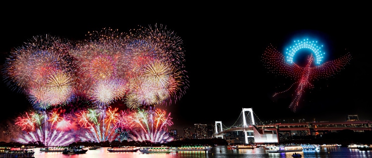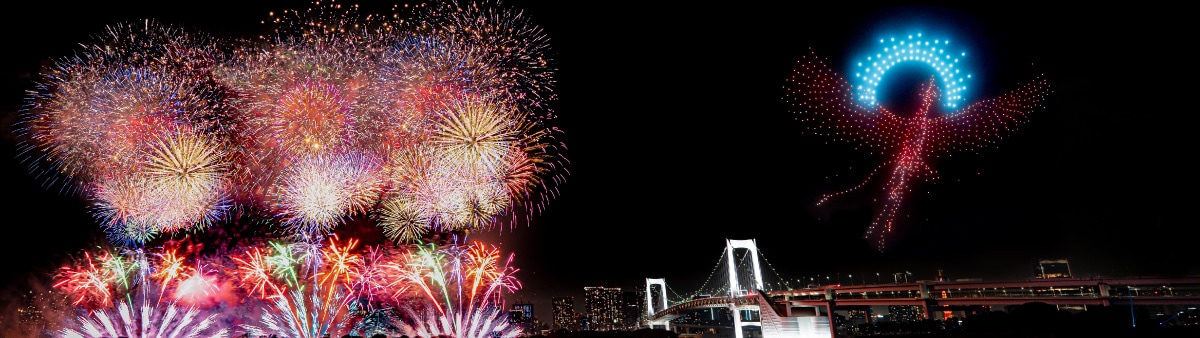 花火と無数のドローンが夜空を彩る「未来型花火ショー」を