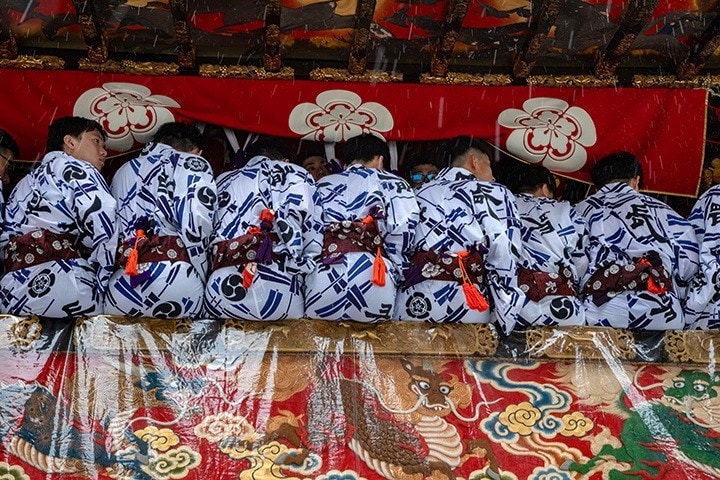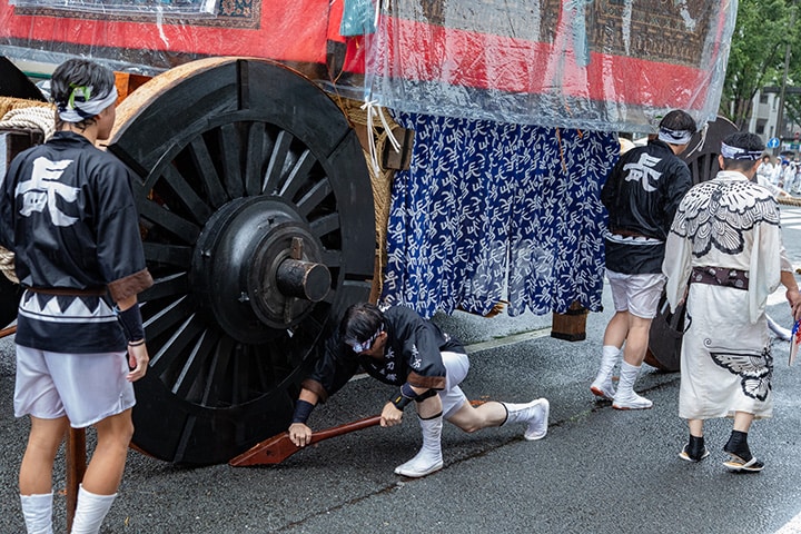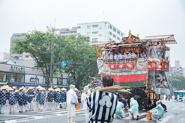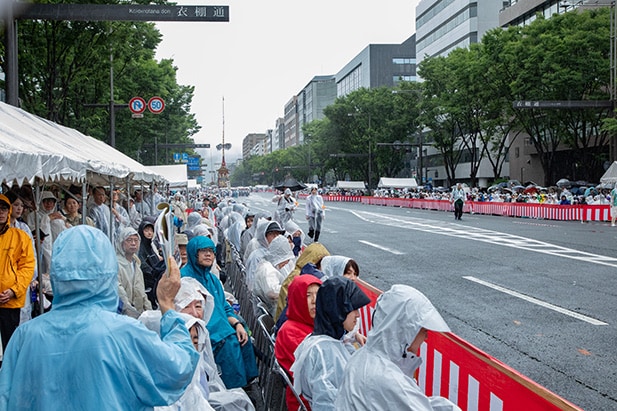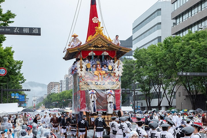 祇園祭の山鉾巡行〈前祭〉は、あいにくの雨模様となりましたが、お稚児さんを乗せた長刀鉾を先頭に、絢爛な一大ページェントが繰り広げられました。なかでも最大の見せ場となる辻廻しでは、一糸乱れぬ技と心意気によって、鉾が力強く回転。辻廻し貸切観覧席からしかご覧いただけない、特別な光景を間近でご堪能いただきました。