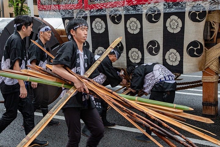 割竹を抱え、山鉾の辻廻しの準備開始。