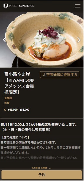 - KIWAMI Dining(以下、「本プログラム」という。)は、アメリカン・エキスプレスが、本プログラム参加登録から席を確保し、アメリカン・エキスプレスのグループ会社であるポケットコンシェルジュが運営するサービス(以下、「予約システム」という)を通じて、カード会員様に提供するプログラムです。