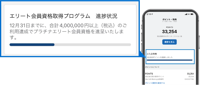 - このエリート会員資格のアップグレードは、基本カード会員様のみがご利用いただけます。ただし、カードご利用金額は家族カードでのご利用分も合算されます。