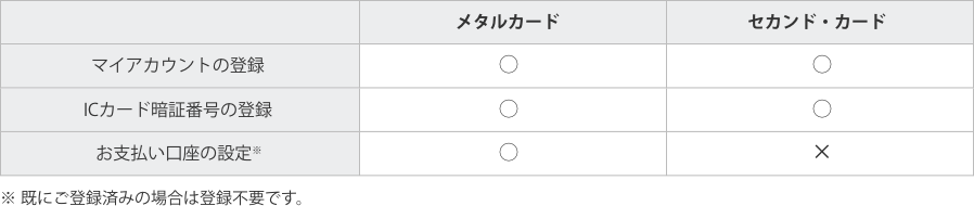 お支払い口座は、メタルカード(基本カード)登録するため、セカンド・カードでの登録はできません。