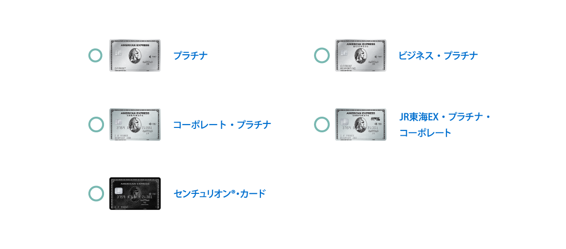 - ※センチュリオン・カード、プラチナ・カード、ビジネス・プラチナ・カードに付随するアメリカン・エキスプレス・ゴールド・カード、アメリカン・エキスプレス・カード、ビジネス・ゴールド・カードではご利用いただけません。