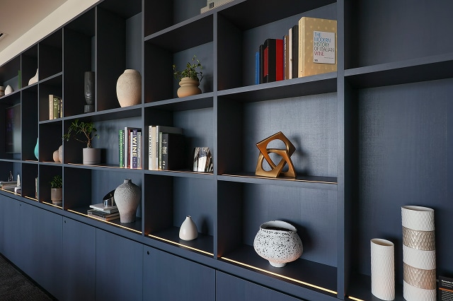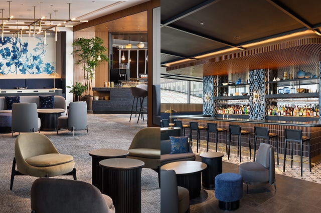 ラウンジ全体に「ジャパンブルー」を採用し、落ち着きと上質さを演出。壁面やタイルなど随所に藍を配し、日本の伝統色がもつ静寂と安定を空間全体で表現しています。