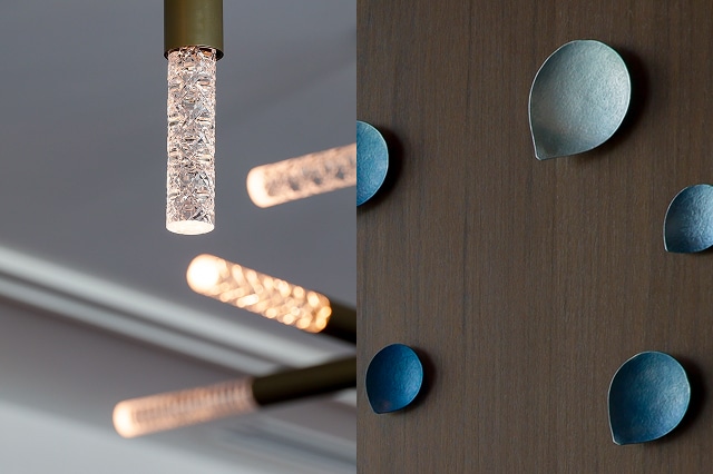日本の伝統文化に着想を得た意匠が随所に息づきます。切子細工の照明が繊細な光を落とし、木や石など天然素材の質感とともに、和の美意識を現代的に表現しています。