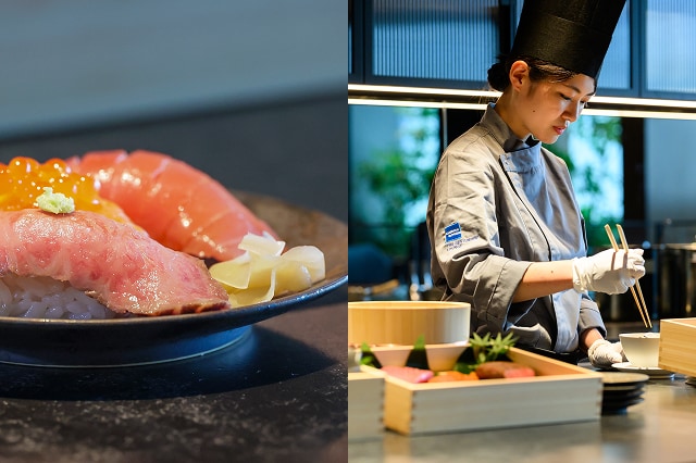 ラウンジ内のライブキッチンで、シェフが一品ずつ丁寧に調理。幻の和牛・尾崎牛を使った肉寿司やスライダーバーガーをはじめ、できたての料理を五感で味わっていただけます。