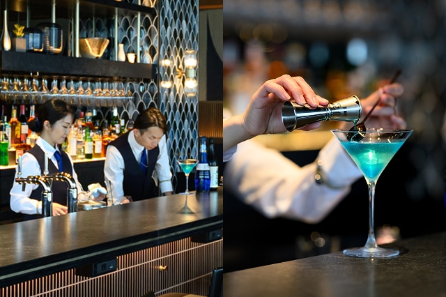 バーカウンターでは、奥飛騨の日本酒をベースにしたシグネチャーカクテル「ブルーバード」をはじめ、厳選された日本のビールやウィスキー、日本酒、焼酎、ワイン、抹茶など、多彩な銘柄をお楽しみいただけます。