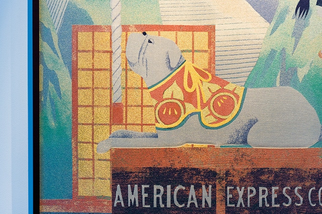 アメックス創業当時のロゴに描かれていたブルドッグ「サー・チャールズ・フロスティ・ブルー」が、狛犬に見立てた西陣織で表現され、訪れる人の旅の安全と幸運を見守ります。