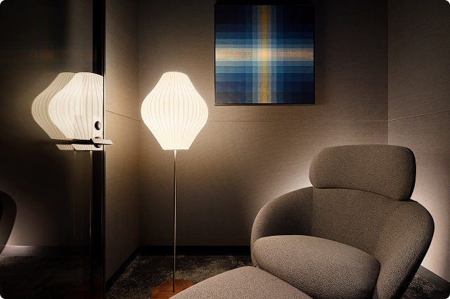 ラウンジ内を飾るアートや工芸作品は、日本の美意識を映し出す存在。