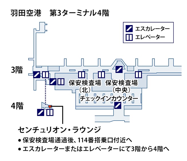センチュリオン・ラウンジは、羽田空港第3ターミナルの保安区域内4階にございます。