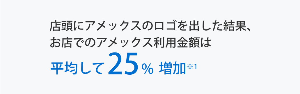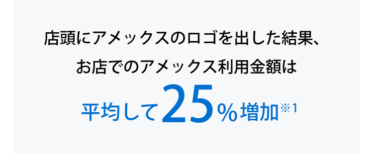 ※1 出典:アメリカン・エキスプレスが保有する14業種にわたる27,962の小規模店のデータに基づき、アメリカン・エキスプレスのカード全体に対する総利用金額について、アメリカン・エキスプレスを示す看板表示の12ヶ月前後と6ヶ月後を比較したものです。