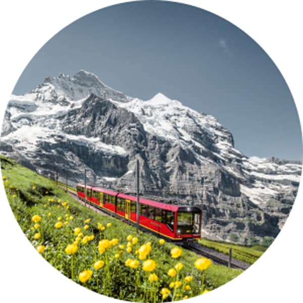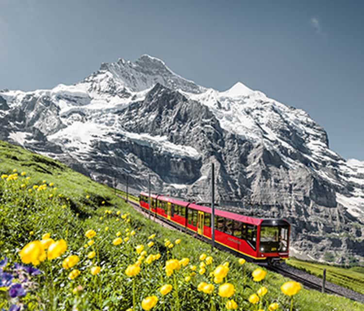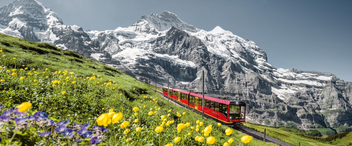 名峰や氷河、初夏には高山植物の花々が車窓を彩ります。終点ユングフラウヨッホ駅はヨーロッパ最高地点の鉄道駅です。