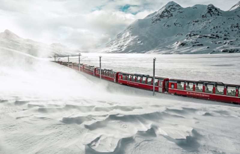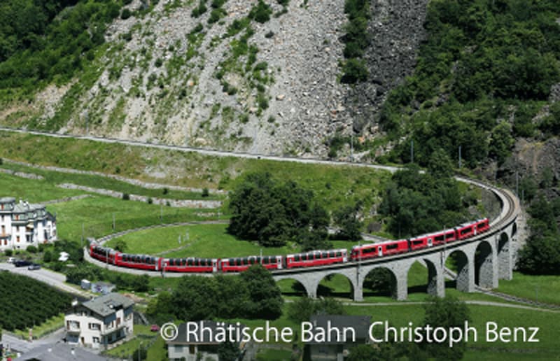 アルプスを超え、イタリアのぶどう畑が広がる谷まで、高低差1,800mの起伏あるルートを約2時間で駆け抜ける急行列車。大きな円を描くオープンループ橋は、ベルニナ急行のハイライトの一つです。