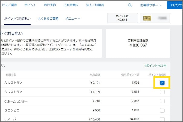 - ポイント充当額は請求金額に対し減額されるため、カードご利用代金の請求がない場合には、本サービスは利用できません。