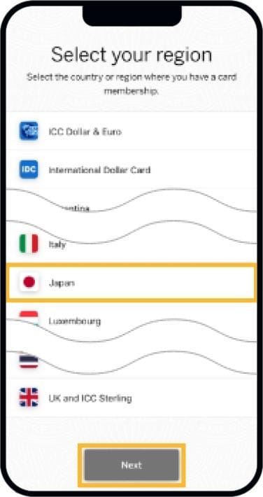 お持ちのカードの発行国を設定します。 Select your region の画面で「Japan」をご選択ください。