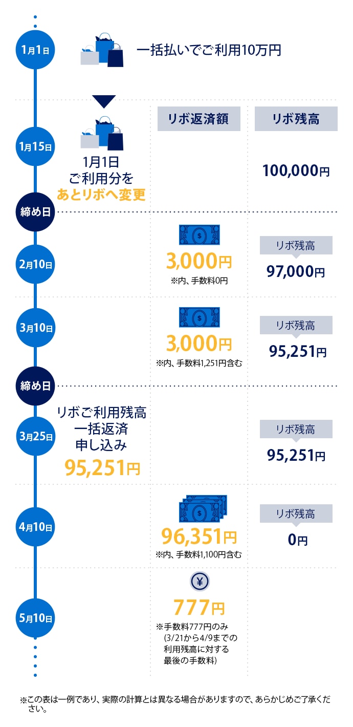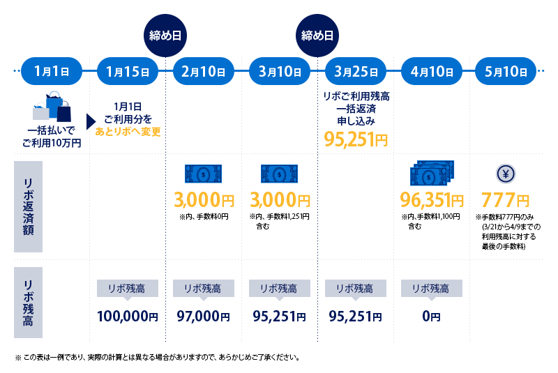ご利用代金明細書締め日時点のリボ残高全額を一括返済した場合でも、ご利用代金明細書締め日の翌日からお支払い日(決済日)前日のリボ残高に対するリボ払い手数料は請求させていただきます。あらかじめご了承ください。
