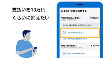 あとリボは、一括払いで決済したあとに、お支払い金額を小さく調整できるサービスです。思いがけず出費が重なった時などにご利用いただくことで、次回以降のお支払い金額を減らせます。