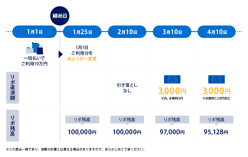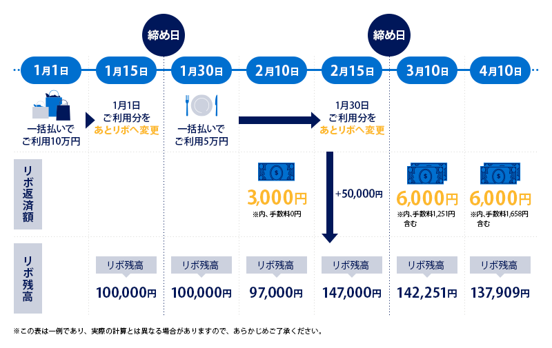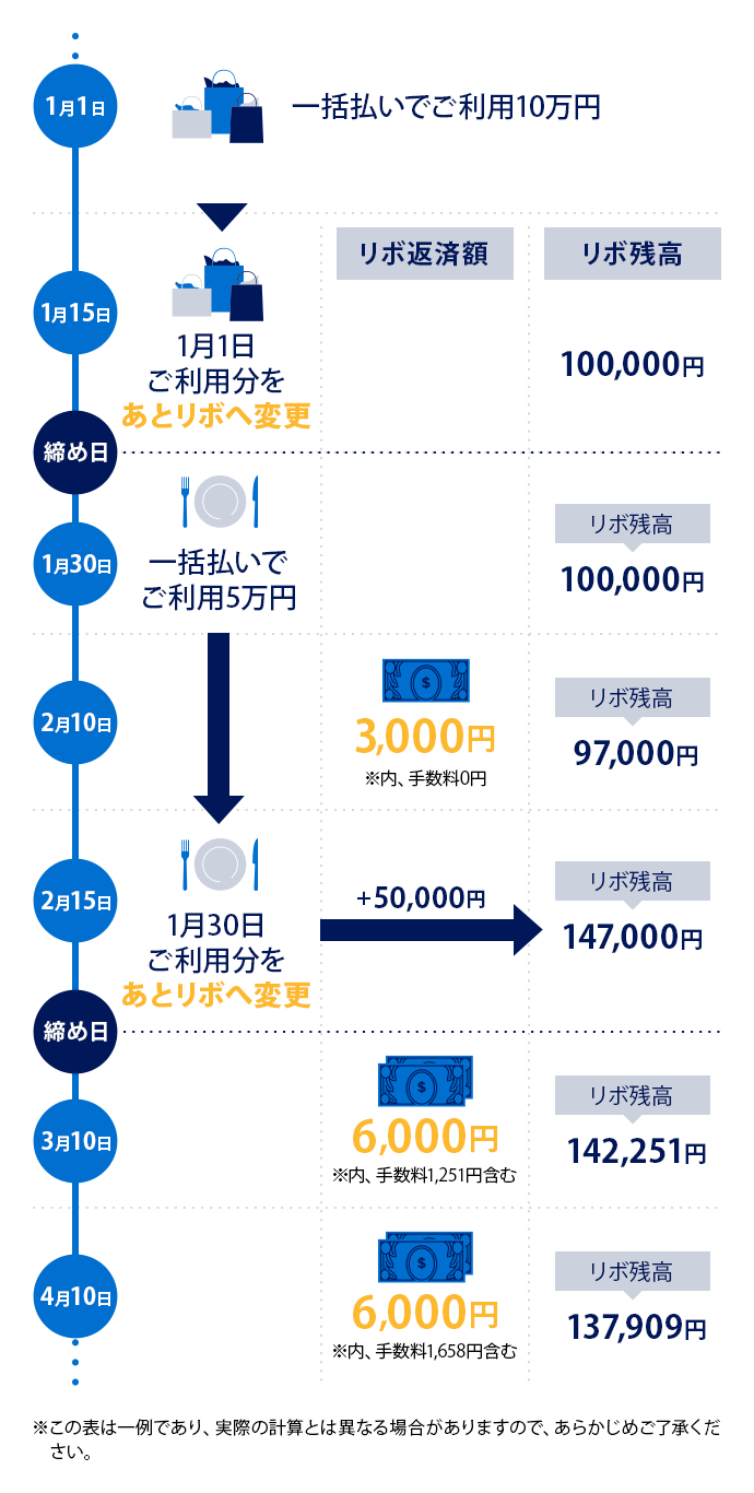 あとリボ変更日から最初に到来する請求締め日の翌日より算出し、最初に到来する請求締め日までの手数料はいただきません。既にリボご利用残高がある場合でも、新たに利用したリボ利用分は、初回請求締め日までの手数料はいただきません。