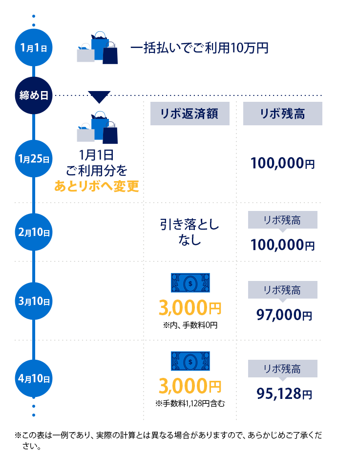 請求確定後(締め日の後)にあとリボに変更した場合、変更分の金額が当月口座振替金額から差し引かれ、次回ご利用代金明細書からリボ払いの請求が開始されます。