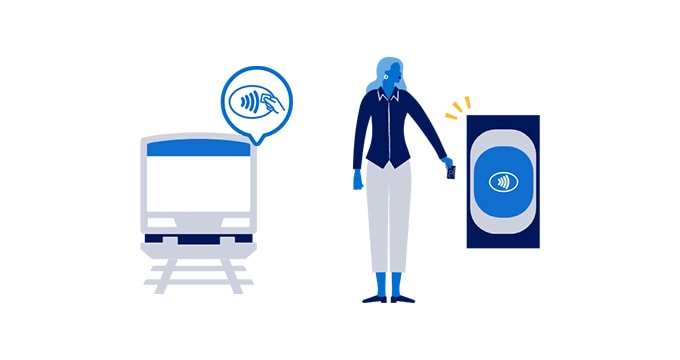 タッチ決済対応のカードやスマホをかざすだけで電車やバスに乗れます。