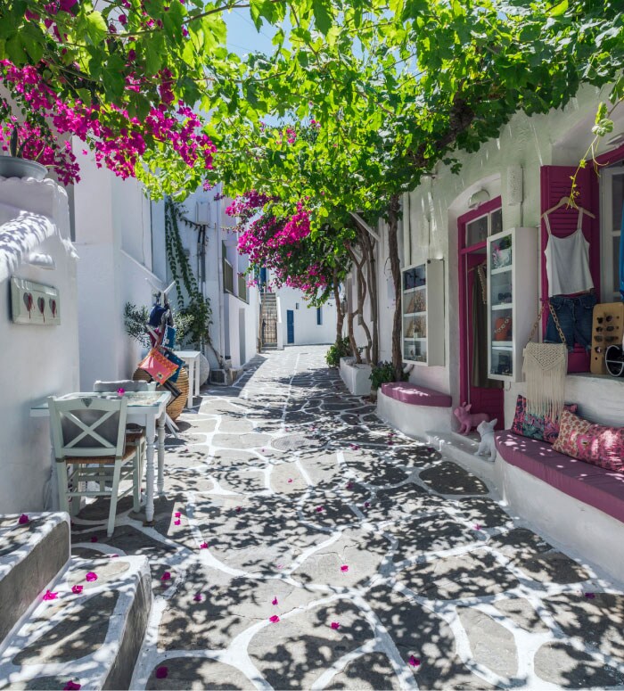 千年の歴史を持つ、島名物の大理石での舗装された「ビザンチン街道(Byzantine Road)」をハイキングするのもおすすめです。漁船が行き交う港町「ナウサ(Naoussa)」ではエーゲ海の新鮮な海の幸を楽しめるタベルナ(食堂)や洗練されたショップが立ち並び、旅を充実させてくれます。