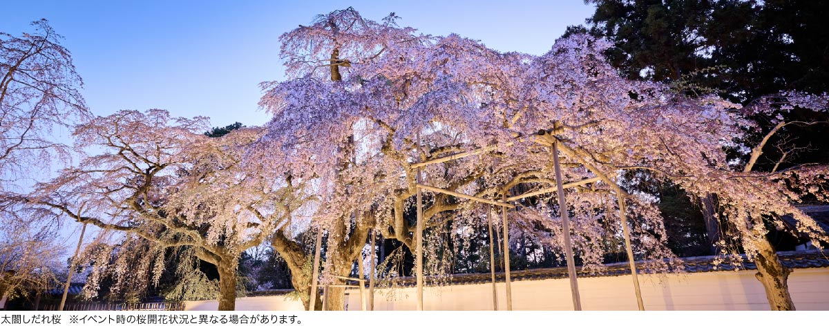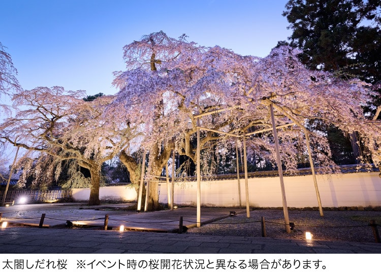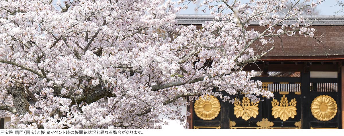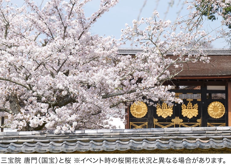 夕刻から三宝院と霊宝館を貸し切り、重要文化財や艶やかな夜桜を鑑賞。三宝院庭園前では僧侶のお話を、霊宝館では音楽とともに観桜をお楽しみいただけます。
