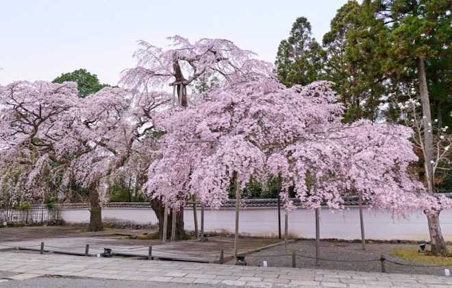 霊宝館は寺宝の保存と公開を兼ねた施設として醍醐天皇千百年御遠忌に計画され、1935年に開館。庭には40本以上の桜があり、大きく枝を廻らせて咲き誇る「醍醐大しだれ桜」は樹齢190年の大木です。