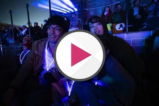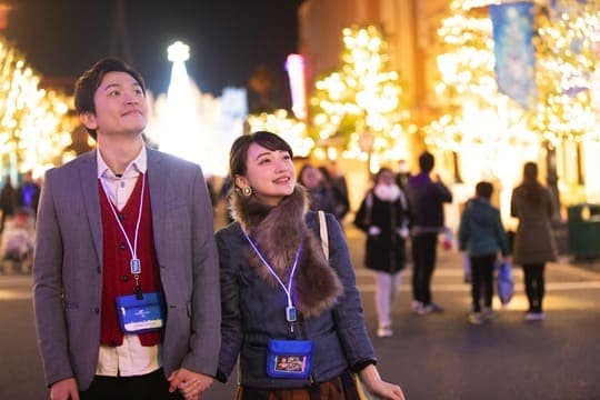 快晴の週末とあって、パーク内はファミリーやカップル、外国人観光客で大にぎわい。日が暮れ始めると、うっとりとするようなイルミネーションが輝きを放ち幻想的な雰囲気に。ツリーが点灯すると歓声が上がり、一気にロマンチックな雰囲気が漂う。首からブルーのクレデンシャルを下げた参加者の姿も目立つように。ボタンを押すと点灯するストラップが気分をさらに高め、貸切の夜に向けてのカウントダウンに心が躍る。