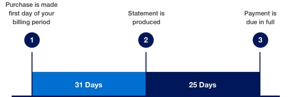 We won’t charge interest on purchases, provided you pay the full amount you owe on each statement date, every month. Otherwise, we’ll charge interest daily from the date an amount is charged to your Account, until it’s paid in full.