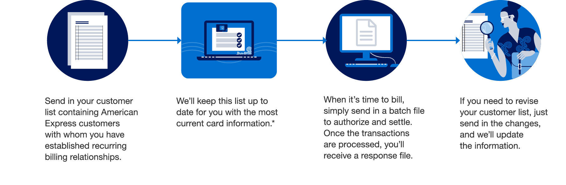 Send us your customer list with Card information of Amex customers that have established recurring-billing relationships with your business. - Amex will keep the list up to date for you with the most current information.*