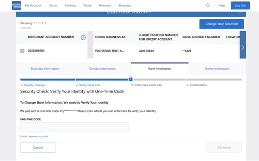 In order to verify your bank information, you will need to follow instructions that will verify your identity for security purposes. A one-time code will be sent to you via email. Once the code is entered correctly, click on the “Continue” button to enter the new bank information.