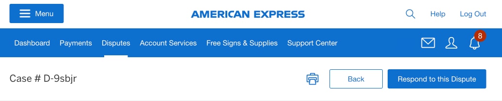 Screenshot of case-level options to print, go back, or respond to the dispute