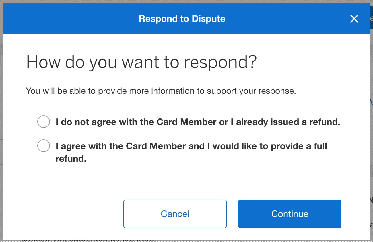 Screenshot of two options once clicking on the Respond to this Dispute button
