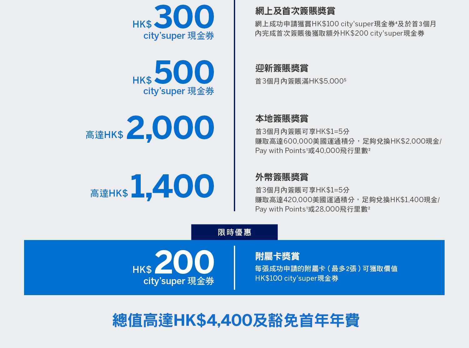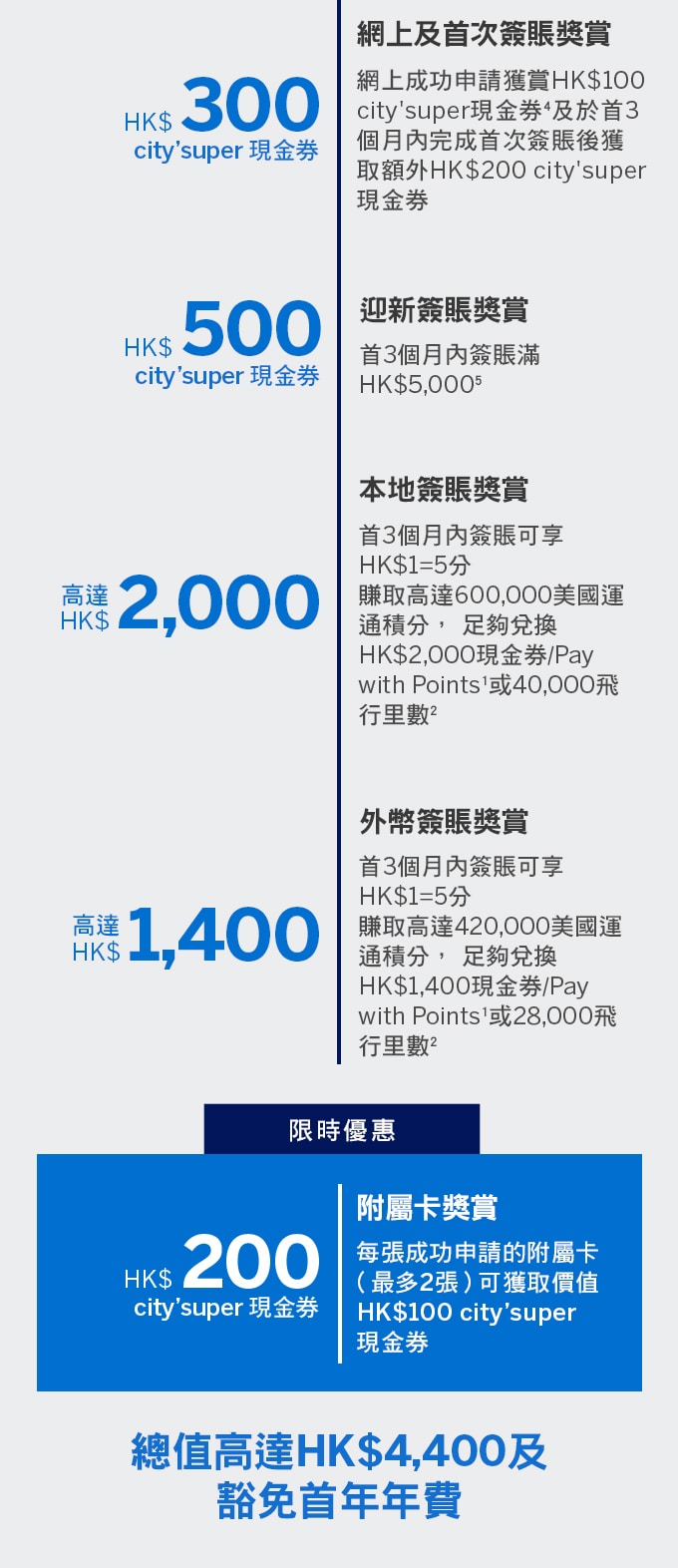 迎新獎賞 總值高達HK$4,4001及豁免首年年費 |
