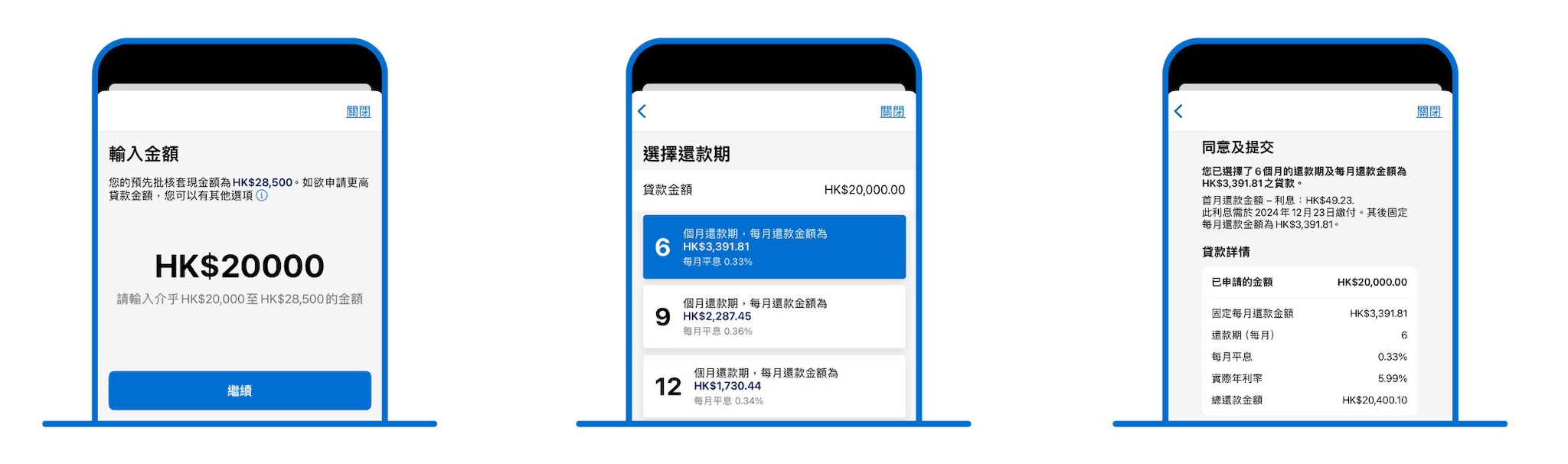 Δ合資格的卡會員可以要求最少 HK$5,000、最多HK$300,000的貸款金額,並取決於您的信用額度之預先批核金額。您可以登入網上賬戶或於 Amex HK 應用程式查閱您的預先批核金額。