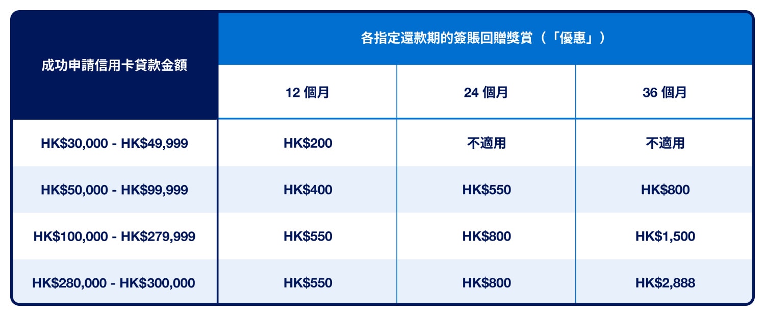 成功申請並獲批的現金分期貸款可獲享高達HK$2,888簽賬回贈1。