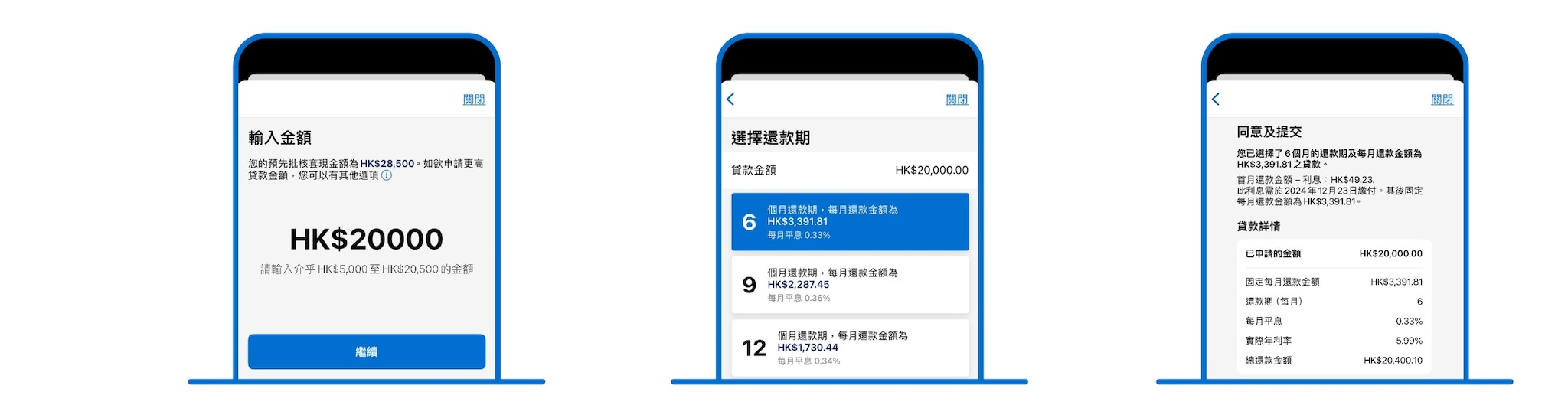 Δ合資格的卡會員可以要求最少 HK$5,000、最多HK$300,000的貸款金額,並取決於您的信用額度之預先批核金額。您可以登入網上賬戶或於 Amex HK 應用程式查閱您的預先批核金額。